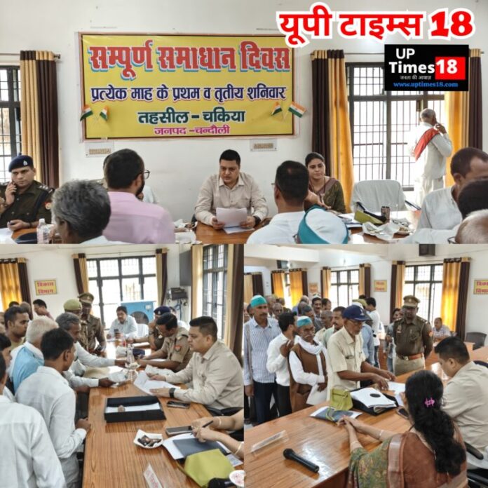 चंदौली : जिले में सोमवार को डीएम निखिल टी. फुंडे की अध्यक्षता में चकिया तहसील सभागार में संपूर्ण समाधान दिवस का आयोजन किया गया. इसमें पड़े कुल 71 प्रार्थना पत्रों में मौके पर 5 मामलों का मौके पर निस्तारण किया गया. ज्यादातर मामले शौचालय, पेंशन, आवास, राजस्व आदि से संबंधित रहे. वही इलिया थाना क्षेत्र के बरांव ग्राम पंचायत अंतर्गत सिहोरियां मौजा निवासी किसान विक्रम चंद्र गुप्ता की फरियाद को सुनकर तहसीलदार सुभाष चंद्र को तलब कर कड़ी फटकार लगाई. निर्देश दिया कि तत्काल नायब तहसीलदार के नेतृत्व में राजस्व कार्यो की टीम गठित कर भूमि की पैमाइश कराई जाए.