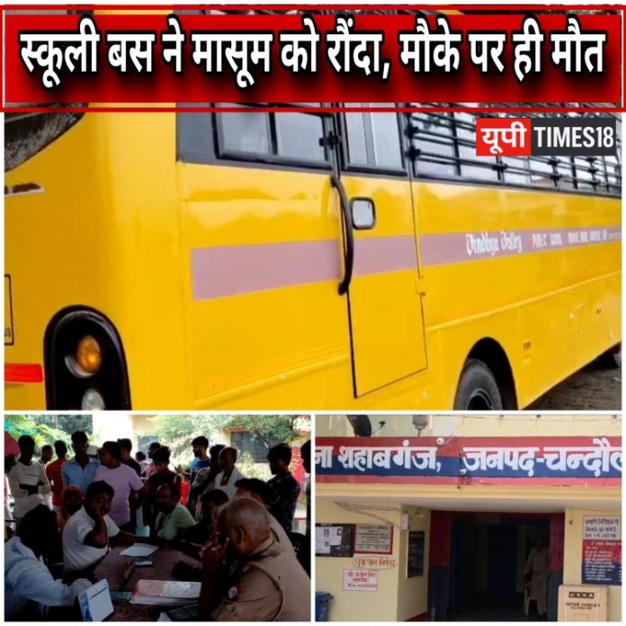 चंदौली : जिले में शनिवार को एक हृदय विदारक हादसा सामने आया। विंध्य वैली स्कूल की बस ने पांच वर्षीय मासूम बच्चे को कुचल दिया। हादसा इतना भीषण था कि मासूम ने मौके पर ही दम तोड़ दिया। घटना के बाद पूरे गांव में कोहराम मच गया। परिजनों का रो-रोकर बुरा हाल है, जबकि ग्रामीणों में गुस्सा व्याप्त हो गया।