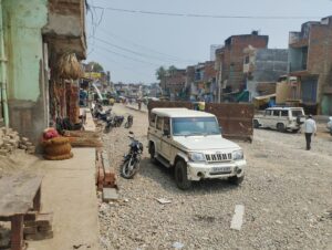 सड़क के दोनों तरफ छोड़ी गई गिट्टी