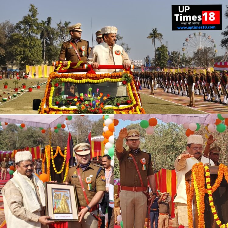 चंदौली : जिले में 76वें गणतंत्र दिवस के अवसर पर जिला मुख्यालय स्थित महेन्द्र टेक्निकल इण्टर कालेज के ग्राउण्ड में जनपदीय पुलिस द्वारा भव्य परेड का आयोजन किया गया. इस अवसर मुख्य अतिथि स्टाम्प तथा न्यायालय शुल्क एंव पंजीयन विभाग के राज्यमंत्री रविन्द्र जायसवाल ने राष्ट्रीय ध्वज फहराने के बाद मंच से गुजर रही परेड की सलामी ली. वही राज्यमंत्री ने उपस्थित लोगों को भारत की प्रस्तावना की शपथ दिलाई.