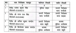 चंदौली : कानून व्यवस्था को चुस्त दुरुस्त रखने के लिए एसपी ने एक बार फिर तबादला किया है. लम्बे समय से एक ही स्थान पर जमे चंदौली कोतवाल गगन राज सिंह को हटाकर पुलिस लाइन में तैनात निरीक्षक राजेश कुमार सिंह को थाना चंदौली का प्रभारी बनाया गया है. वही निरीक्षक गगन राज सिंह को थाना साइबर का प्रभारी निरीक्षक बनाया गया है.