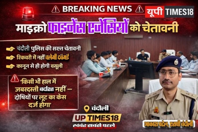 चंदौली : जनपद में माइक्रो फाइनेंस कंपनियों की मनमानी वसूली पर अब पुलिस ने सख्त रुख अपना लिया है। पुलिस अधीक्षक आकाश पटेल की अध्यक्षता में पुलिस लाइन्स स्थित सभागार में आयोजित बैठक में स्पष्ट चेतावनी दी गई कि अगर किसी एजेंट ने गुंडई के बल पर वाहन जब्त करने या दबाव बनाकर वसूली करने की कोशिश की, तो उसके खिलाफ सीधे लूट का मुकदमा दर्ज किया जाएगा।